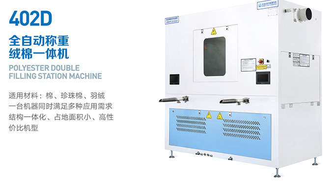 百聯(lián)展品:X型模塊化自動(dòng)充絨機(jī)(2401X)、 402D全自動(dòng)絨棉一體機(jī)
