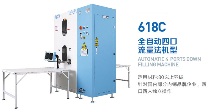 在雙口機型的基礎(chǔ)上升級成四口流量法機型,適用80-90g羽絨,填充范圍0.2-3g,主要針對國內(nèi)部分內(nèi)銷品牌企業(yè)的應(yīng)用需求。