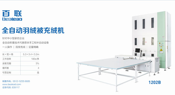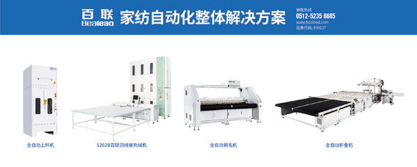 今年以來(lái),百聯(lián)整合家紡自動(dòng)化產(chǎn)品資源,針對(duì)羽絨被、枕頭、靠墊等家紡產(chǎn)品的應(yīng)用需求,推出了可個(gè)性化定制的家紡充填類自動(dòng)化整體解決方案。這些產(chǎn)品主要涉及全自動(dòng)上料機(jī)、羽絨被充絨機(jī)、被子折疊機(jī)、打包機(jī)等,形成了完整的家紡自動(dòng)化流水線,幫助客戶企業(yè)提高生產(chǎn)效率、降低人力成本、提高產(chǎn)品質(zhì)量,為實(shí)現(xiàn)“智能工廠”及“智能生產(chǎn)”提供了有力的保障。