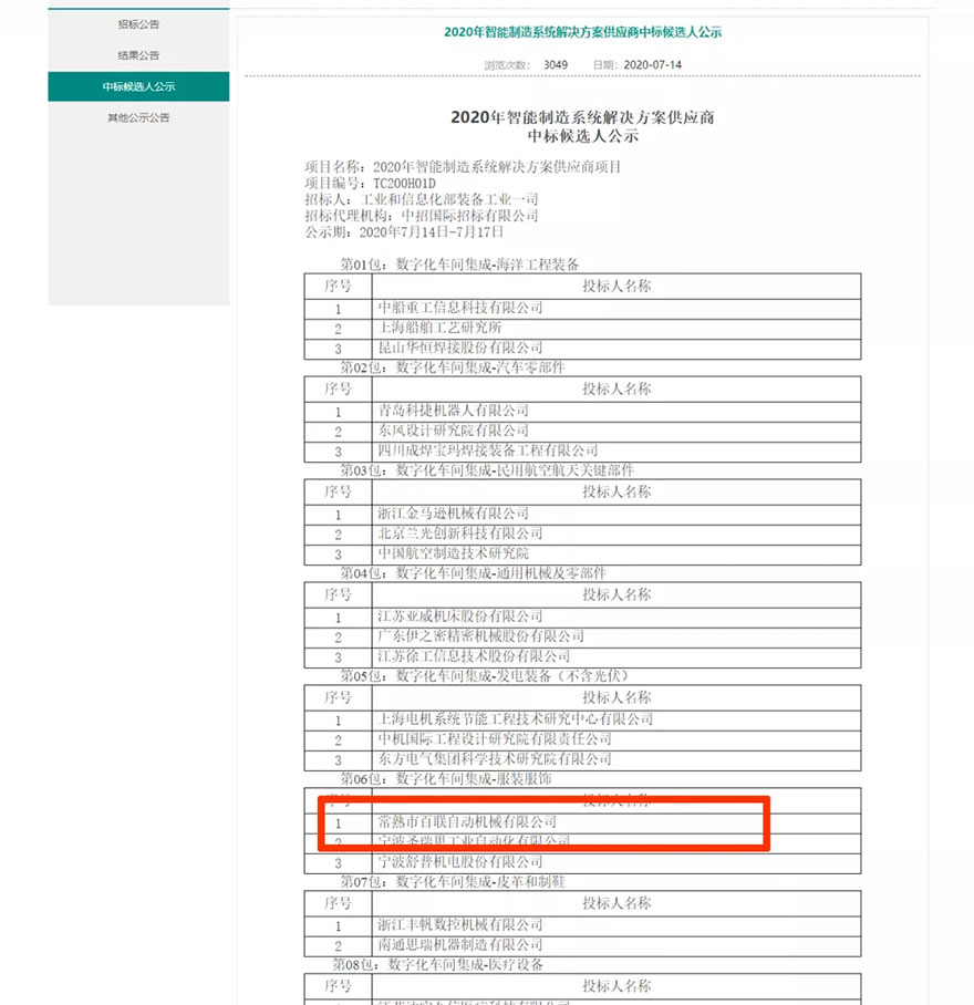 近日,國(guó)家工業(yè)和信息化裝備工業(yè)一司委托招標(biāo)代理機(jī)構(gòu)中招國(guó)際招標(biāo)有限公司公示了“2020年智能制造系統(tǒng)解決方案供應(yīng)商”中標(biāo)候選人名單。我司(常熟市百聯(lián)自動(dòng)機(jī)械有限公司)經(jīng)過(guò)與多方競(jìng)爭(zhēng)及嚴(yán)格篩選成為中標(biāo)候選人,成功中標(biāo)“數(shù)字化車間集成-服裝服飾”項(xiàng)目。